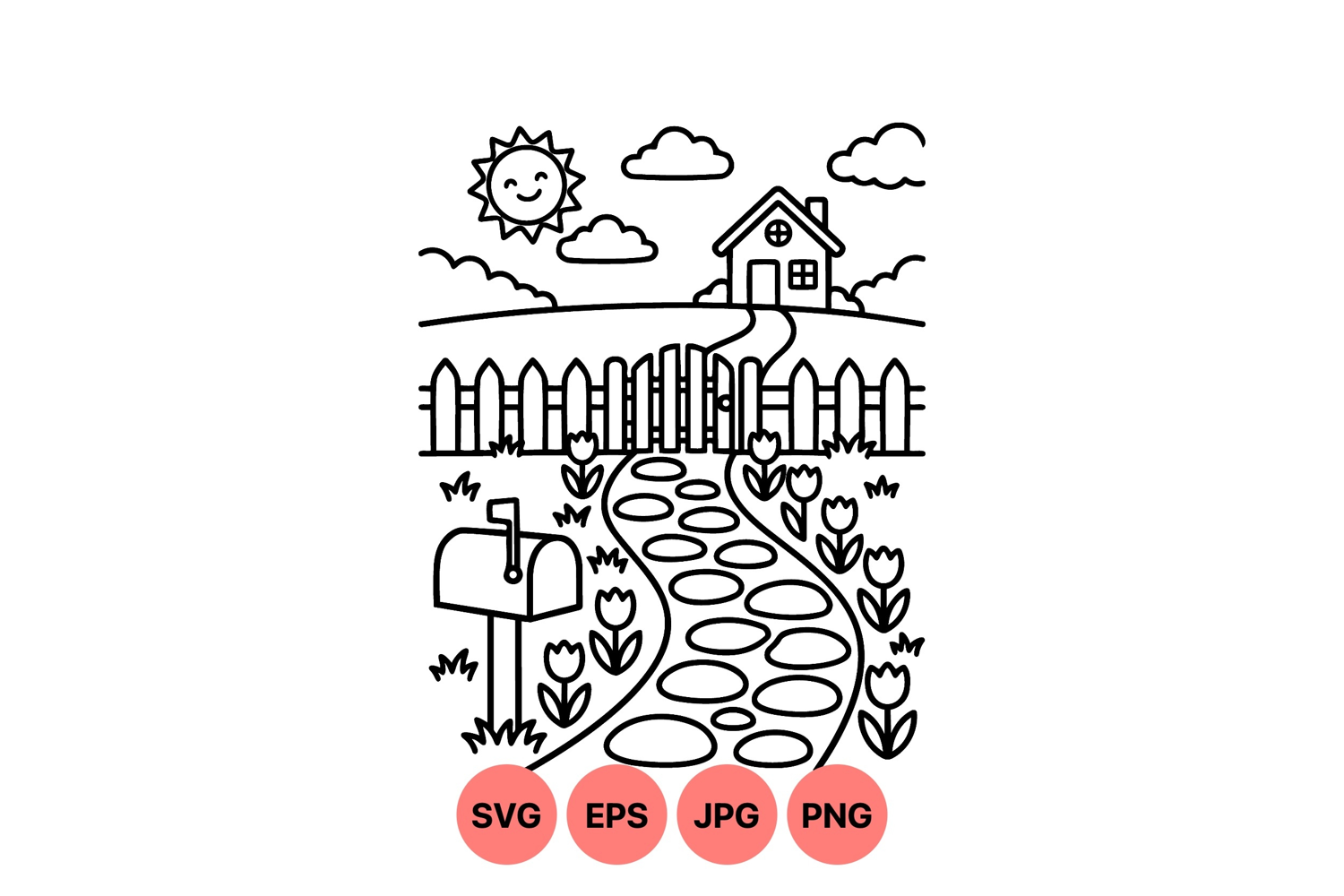 Kids Coloring Printable Spring Flower Illustration Nature Scene Vector Picket Fence Clipart Black White Lineart Hand Drawn Garden Country Path Clipart Mailbox Outdoor Design Rural House Drawing Stone Walkway Graphic
