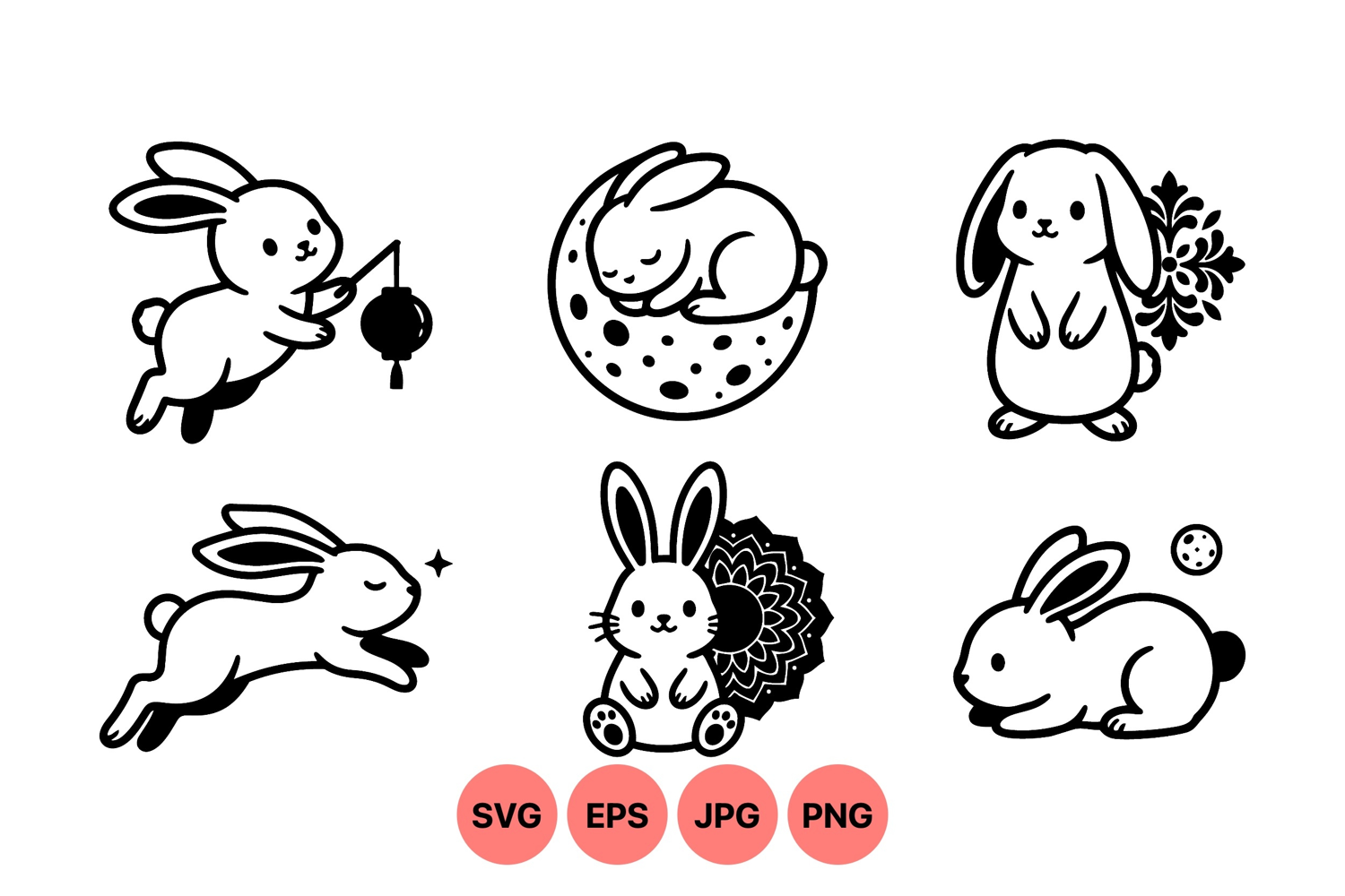 A of minimalist black and white rabbit icons shows different postures including holding a lantern jumping sleeping and sitting with decorative floral and mandala details