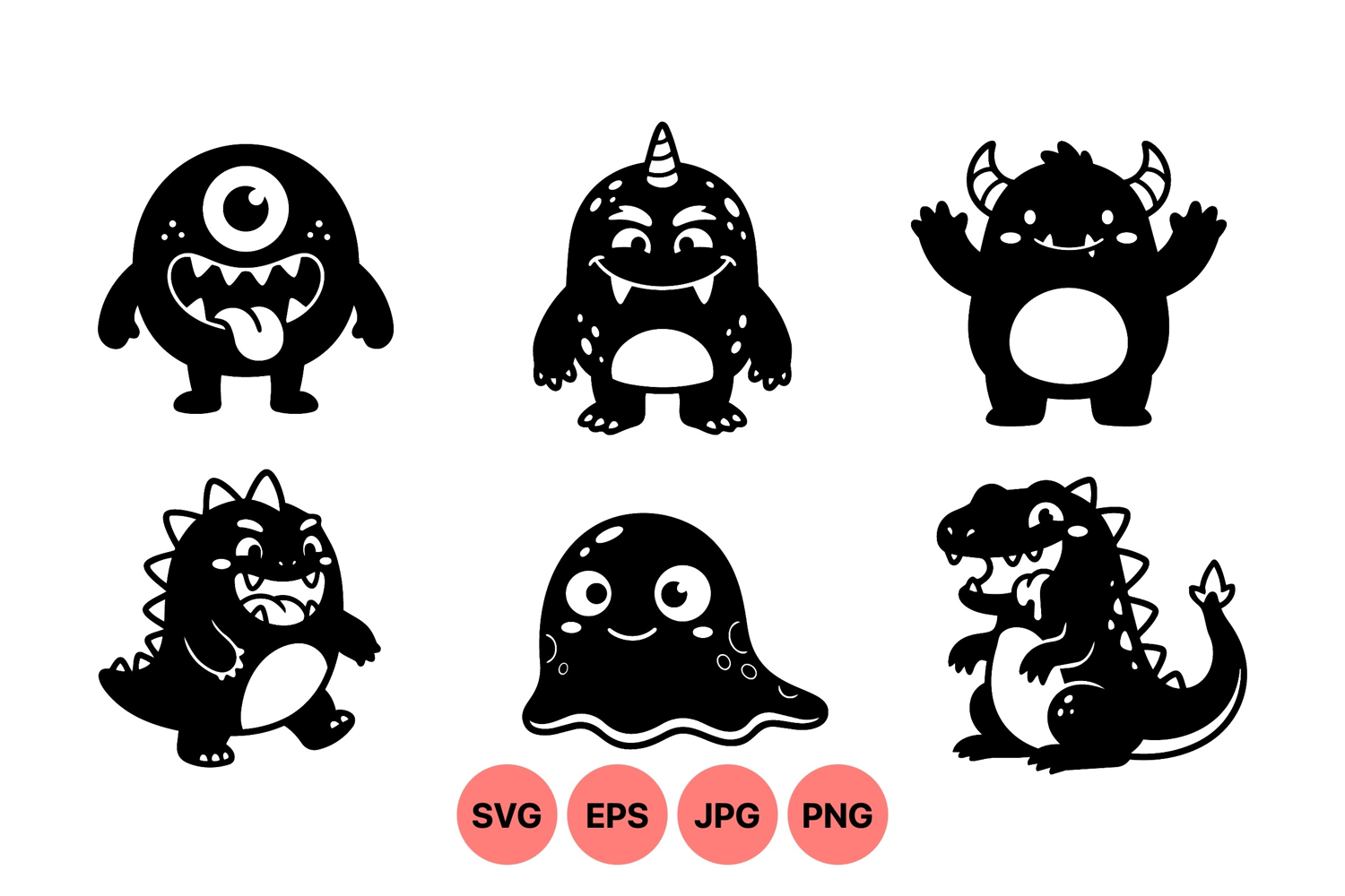 Whimsical black and white cartoon monsters featuring playful cyclops vampire dinosaur and jellyfish with friendly expressions perfect for children books stickers or fun graphic elements lively and charming