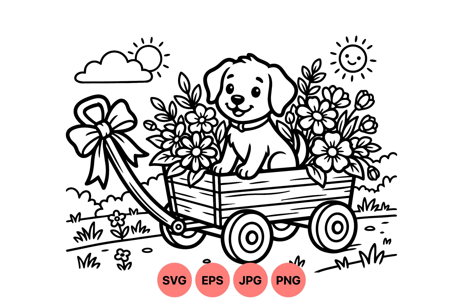 Cute Puppy In Floral Wagon Black White Vector example image 1