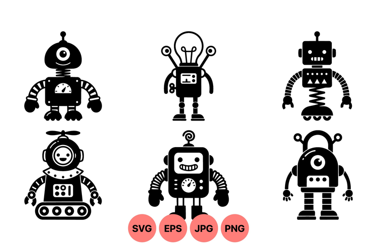 Six distinct black silhouette robots with smiling faces display mechanical arms legs and different head designs including antennas and propeller in a retro vector style with playful mood