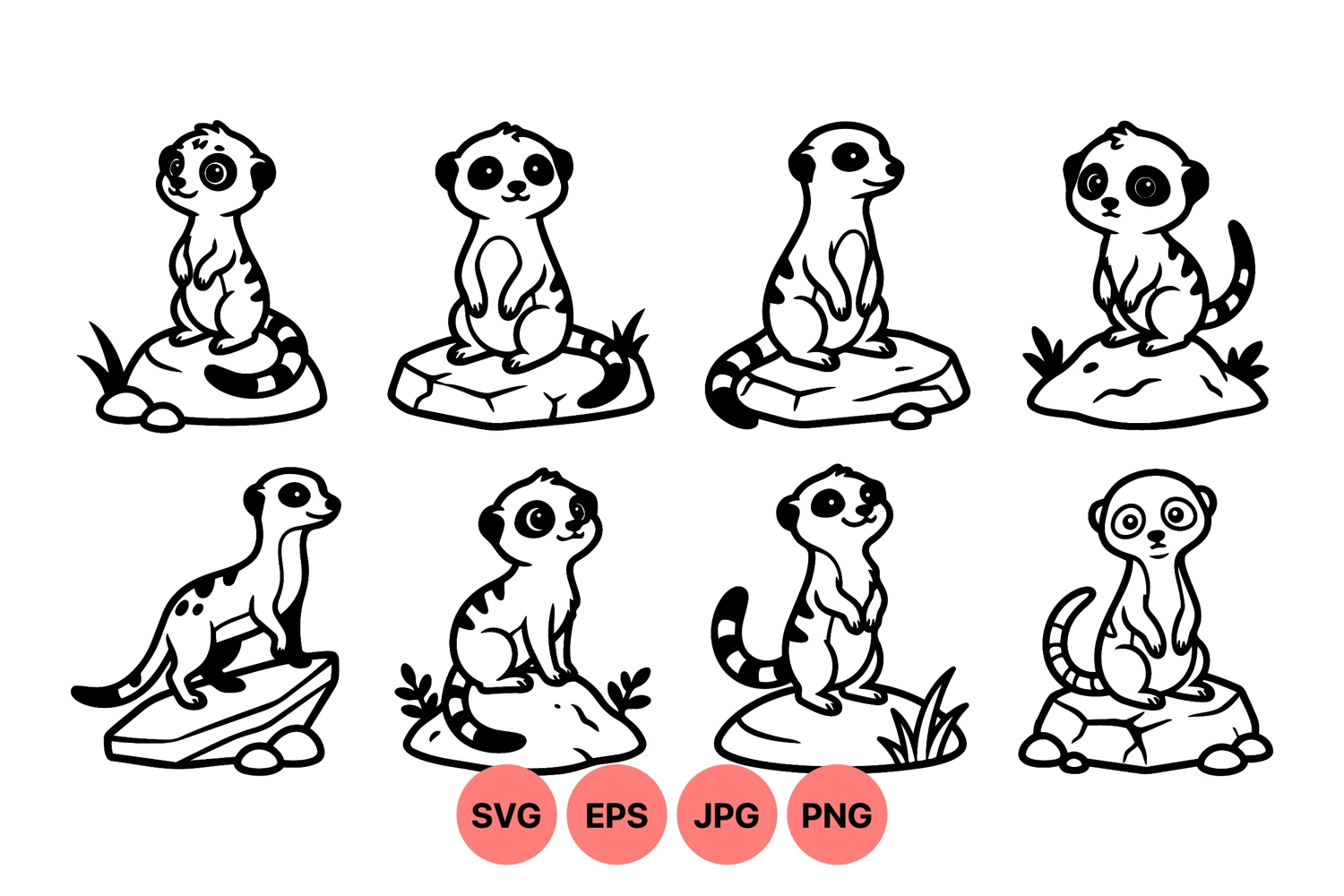 A of eight black and white cartoon meerkats depicted sitting and standing on different rocks and ground elements in a simple line art style suitable for kids designs and stickers.