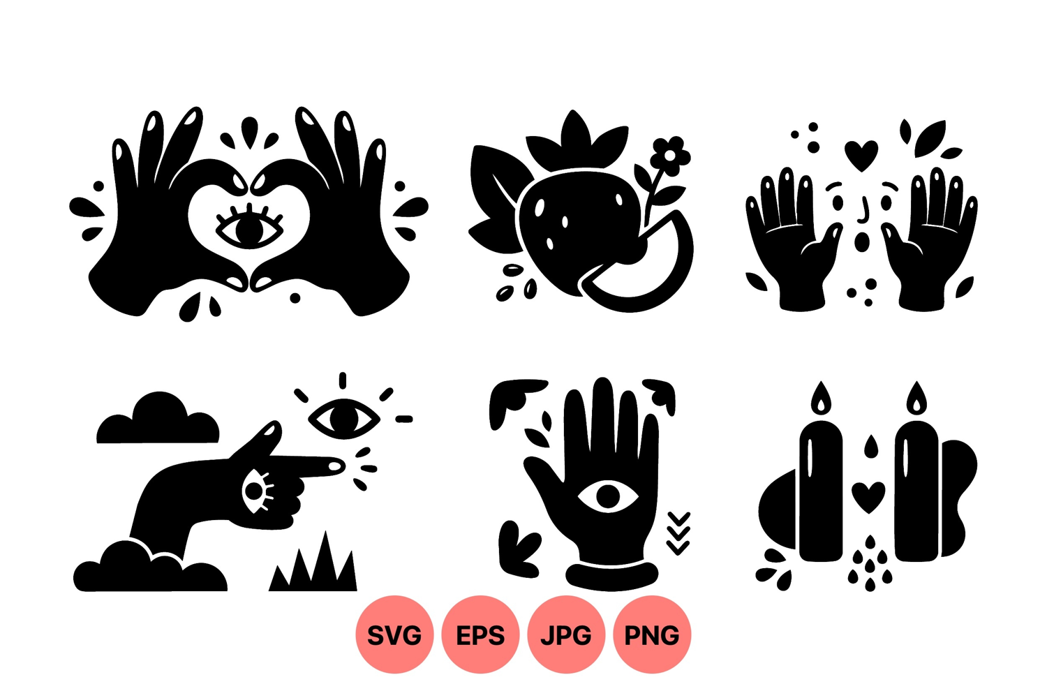 This flat design vector features mystical symbols including hands with eyes flowers and candles displayed in black silhouette style for spiritual and decorative use.