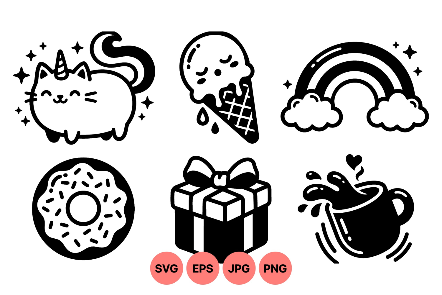 A of black and white vector icons including a smiling unicorn cat with sparkles donut with sprinkles melting ice cream cone rainbow gift box and coffee splash lively whimsical style