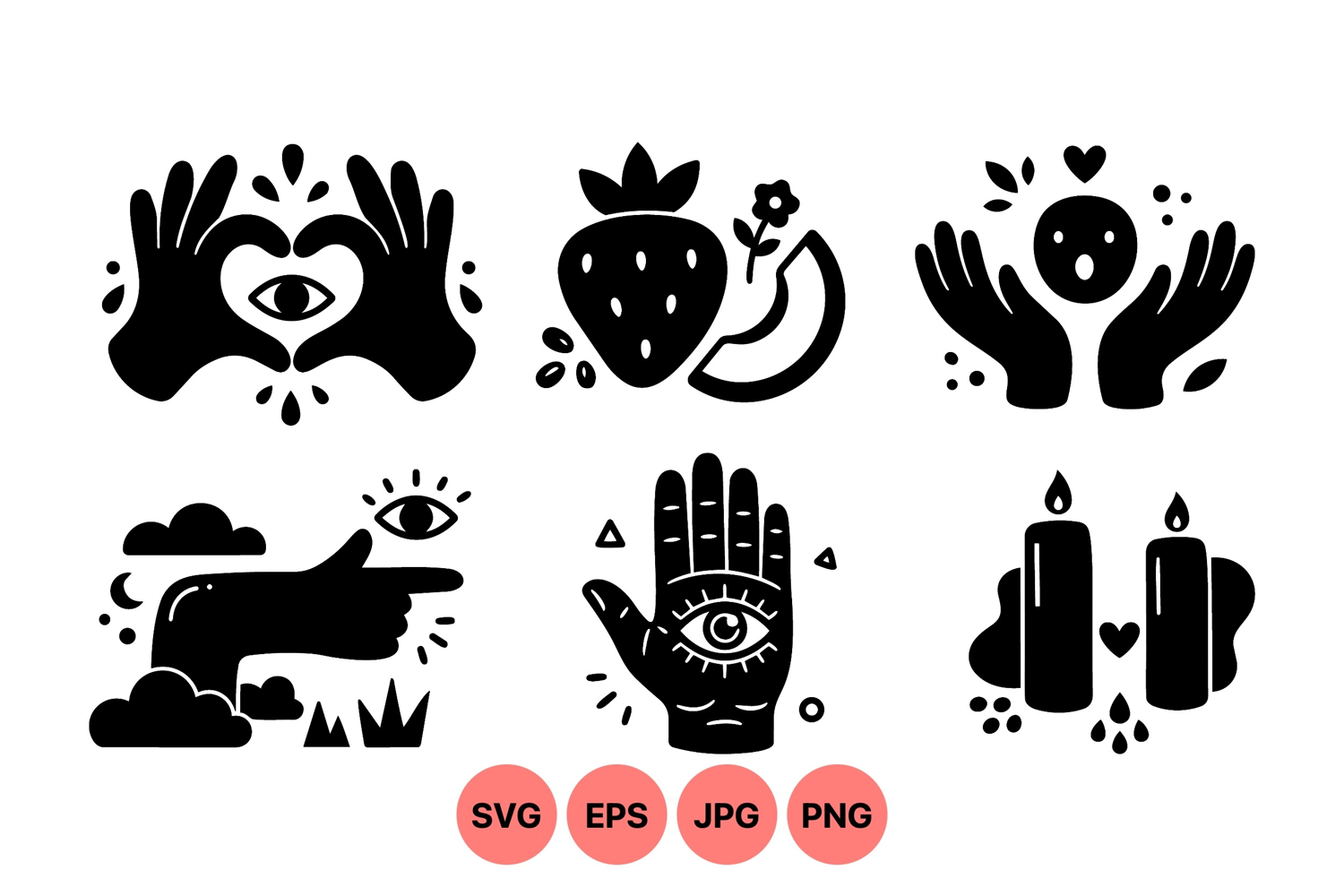 A of black silhouette mystic symbols featuring hands with eye motifs, fruit, candles, and natural elements presented in a bold flat vector style with mystical mood.