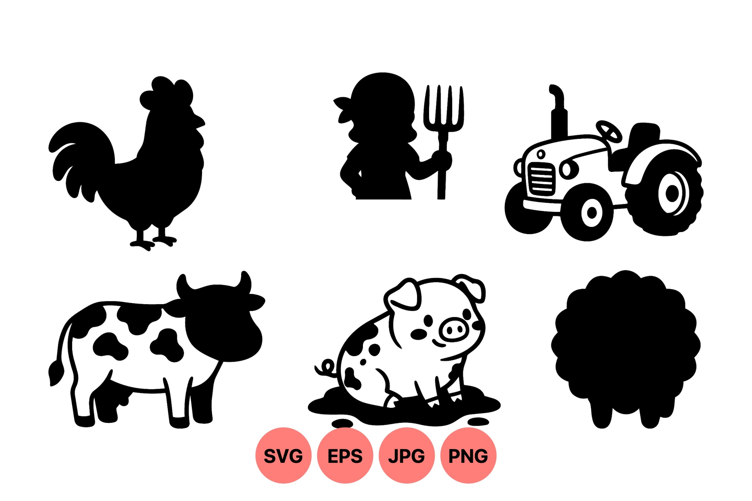 Farm Animal Clipart Farm Tractor Design Silhouette Vector Art Cute Pig Vector Black Silhouette Artwork Rooster Animal Graphic Cow Livestock Illustration Barnyard Animal Image Farmer Holding Pitchfork Rural Farming Icon