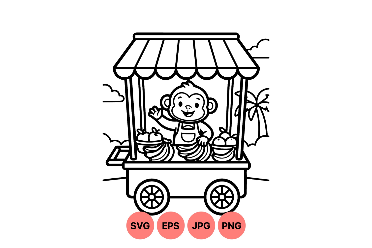 A cheerful monkey vendor waves while selling bananas and apples from a mobile fruit cart with canopy in a tropical outdoor setting featuring palm trees and clouds bright line art style playful and lively