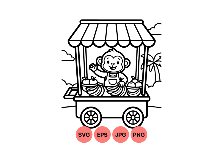 Cute Animal Clipart Line Art Illustration Tropical Fruit Clipart Kids Friendly Design Black White Vector Digital Clipart Art Monkey Fruit Vendor Fruit Cart Drawing Playful Market Scene Simple Cartoon Design