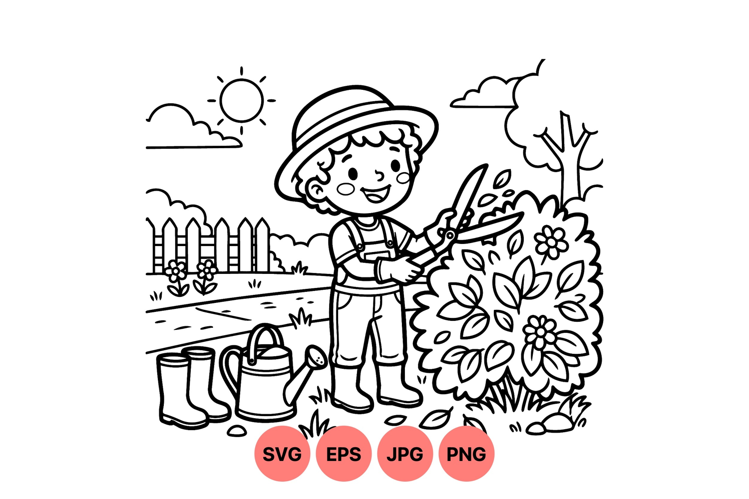 Smiling child trims a leafy bush with scissors in a sunny garden scene featuring watering can boots and trees in clear line art style peaceful playful mood
