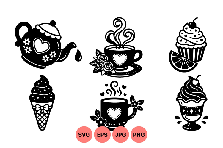 Black and white vector icons showing a tea pot dripping liquid, steam rising from heart decorated cups, and various desserts including cupcake, ice cream cone, and sundae in a charming style.