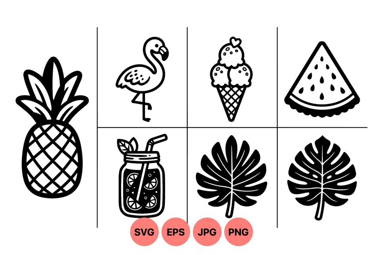 Black And White Svg Ice Cream Illustration Summer Party Decor Summer Fruit Clipart Tropical Leaf Design Watermelon Slice Art Flamingo Bird Graphic Pineapple Vector Image Mason Jar Drink Drawing Minimalist Tropical Icon