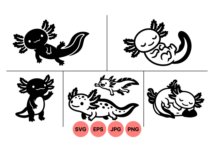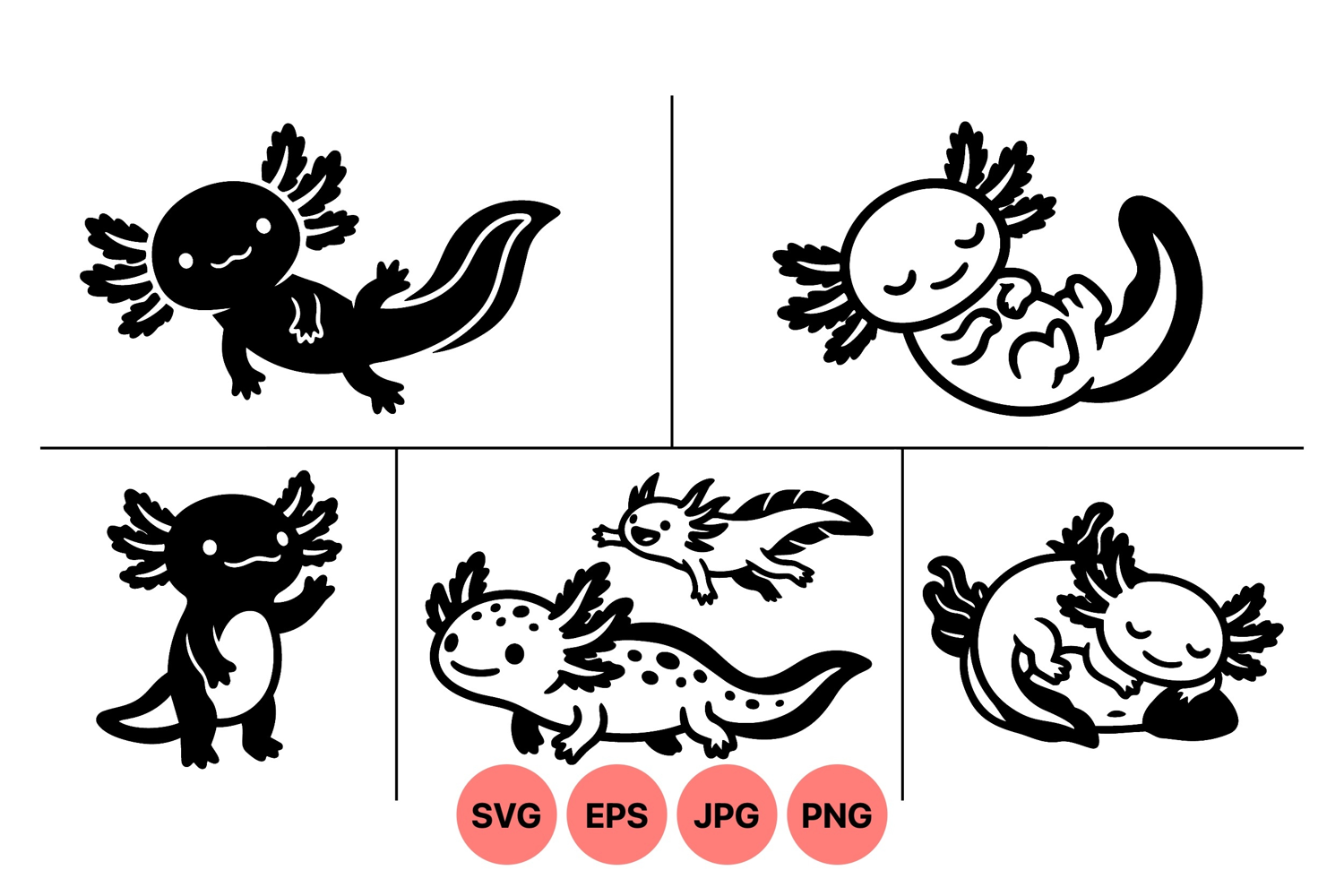 Playful black and white vector illustrations showcase axolotls in different poses such as swimming standing and sleeping with bold simple lines perfect for animal themed designs playful mood