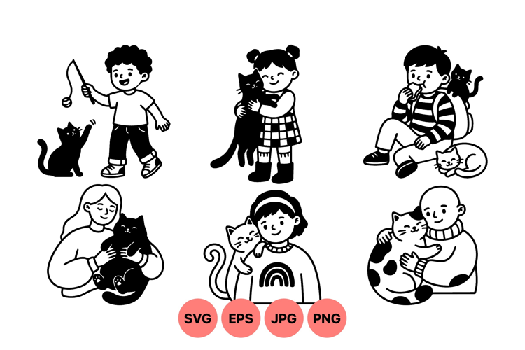 Playful black and white vector illustrations depict kids and adults interacting warmly with cats through hugging playing and relaxing in a cute simple style peaceful and friendly