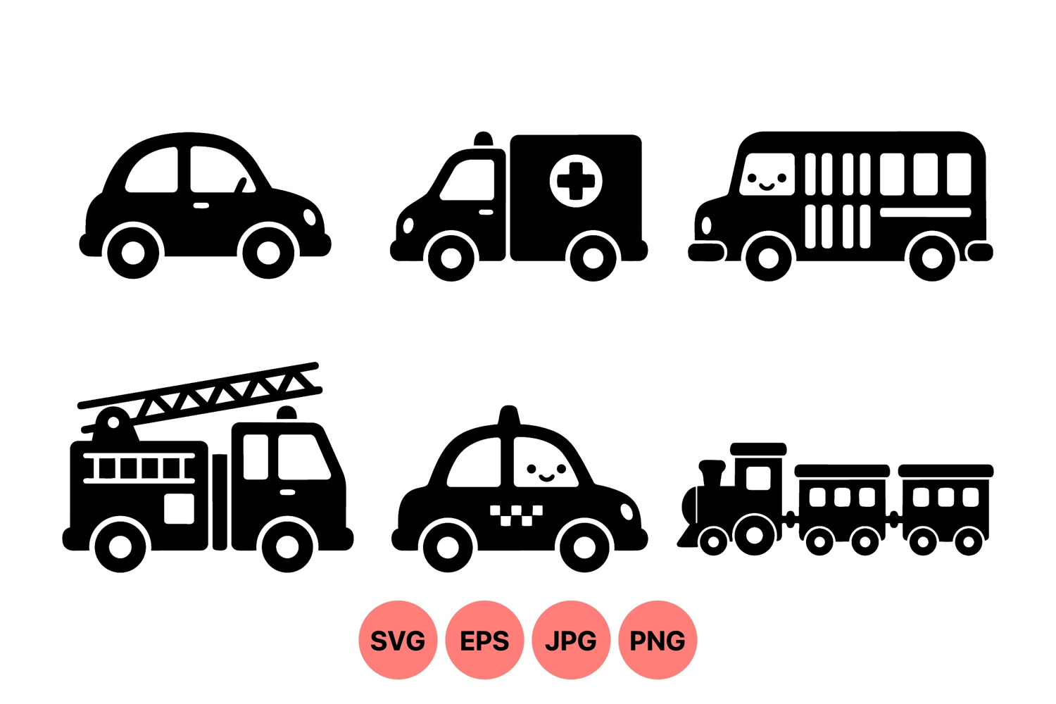 Cute black silhouette vector icons of car ambulance fire truck taxi school bus and train featuring smiling faces in a simple playful flat style for children or apps.
