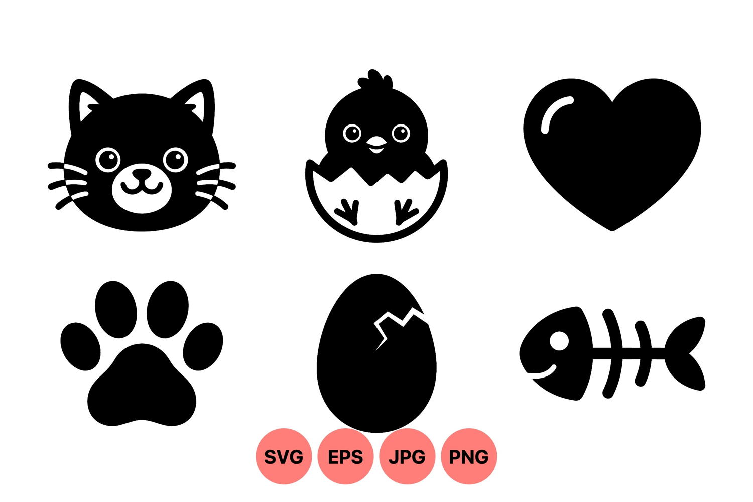 A of six minimal black silhouette icons includes a cute cat face, a chick hatching from an egg, a heart shape, a paw print, a cracked egg, and a fish bone, showing playful pet and animal themes in vector style.