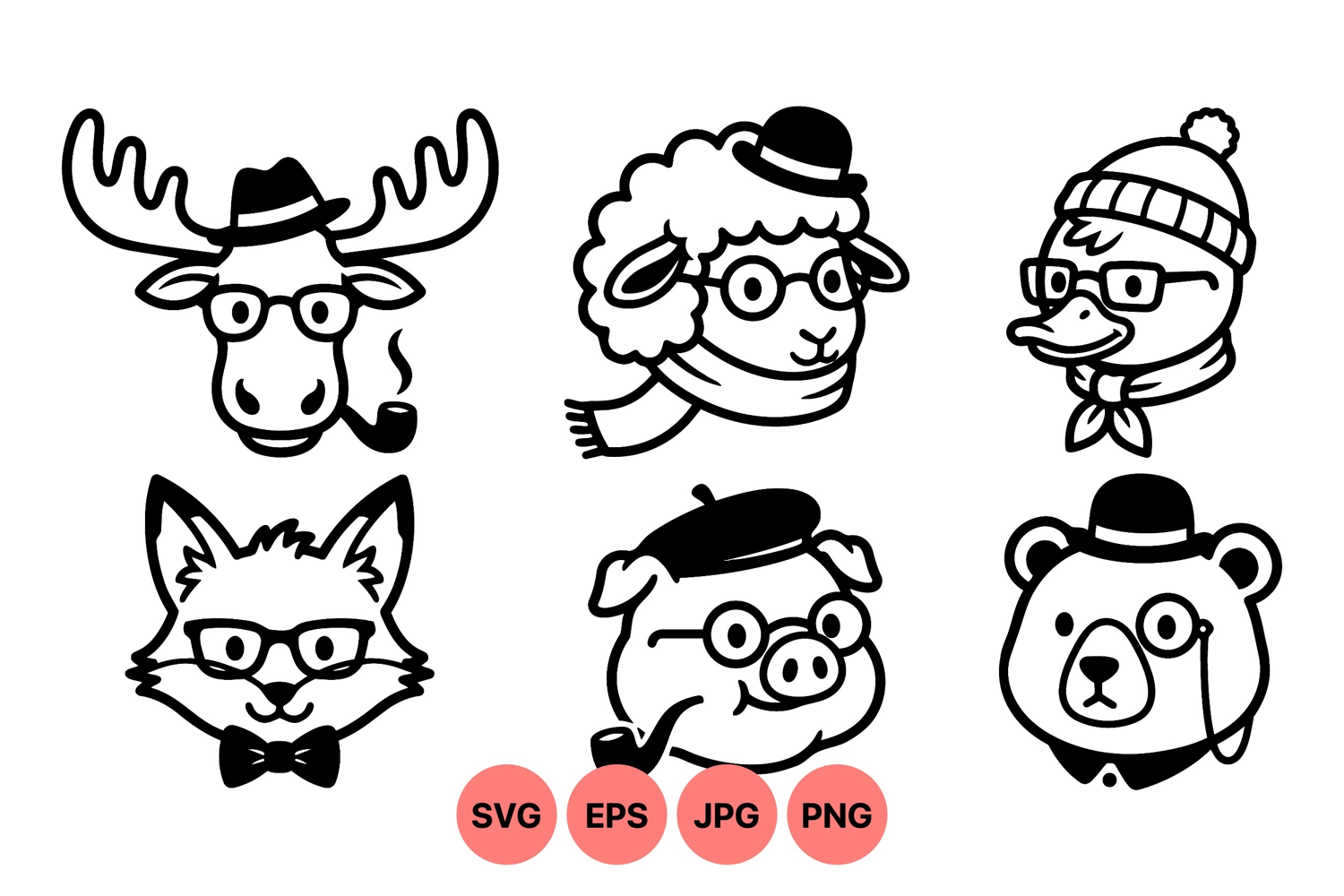 Cute Vector Animals Black White Clipart Funny Animal Faces Animal Vector Illustration Animal Design Elements Animal Head Graphics Hipster Animal Art Stylish Animal Icons Animal Portrait Drawings Accessorized Animal Art