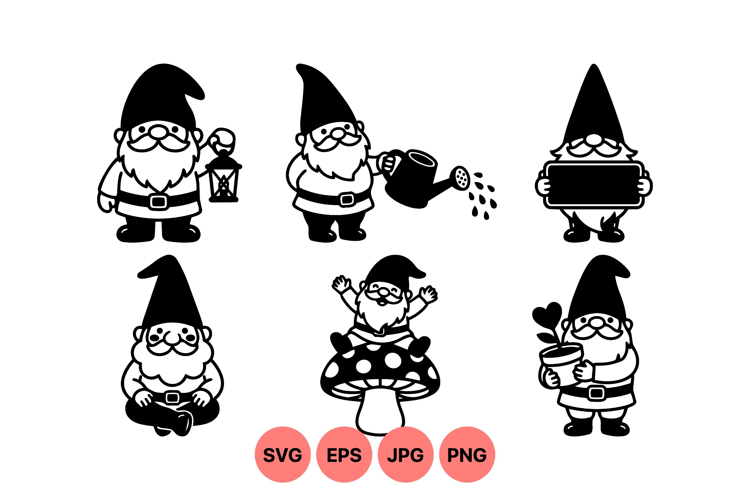 A of black and white vector art shows six garden gnomes engaged in various actions such as holding a lantern, watering plants, holding a blank sign, and sitting on a mushroom with a playful mood.