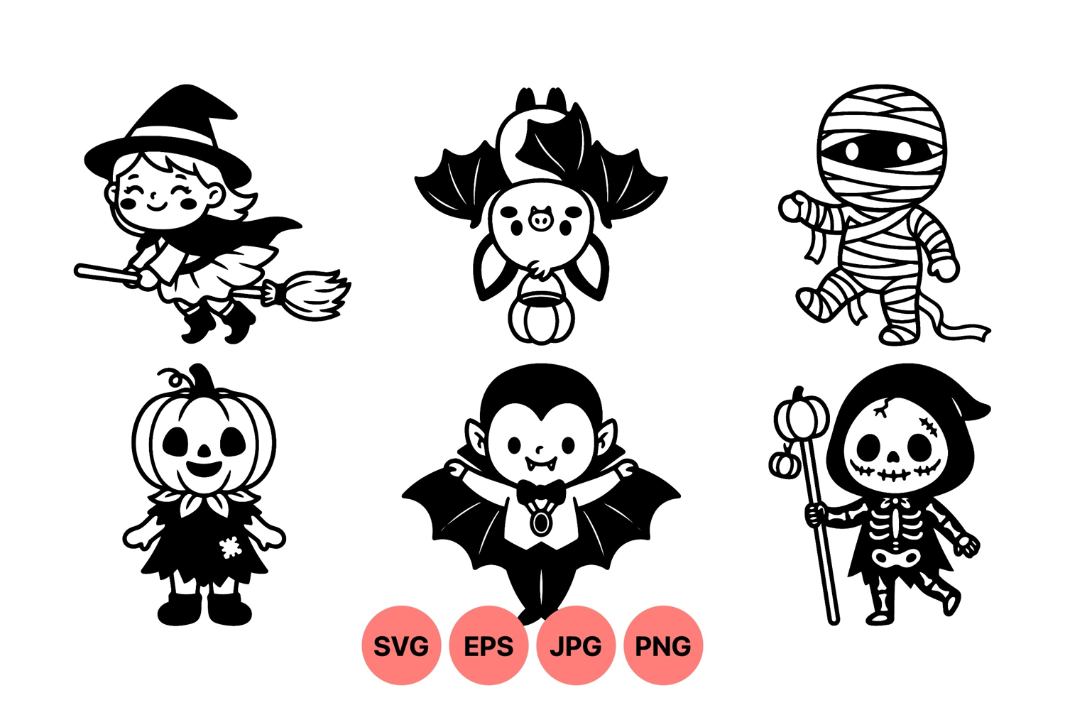 Black And White Svg Halloween Character Clipart Kids Halloween Costumes Cute Spooky Characters Holiday Craft Graphics Vector Halloween Designs Funny Halloween Drawings Scary Halloween Figures Pumpkin Vampire Clipart Witch Mummy Illustrations