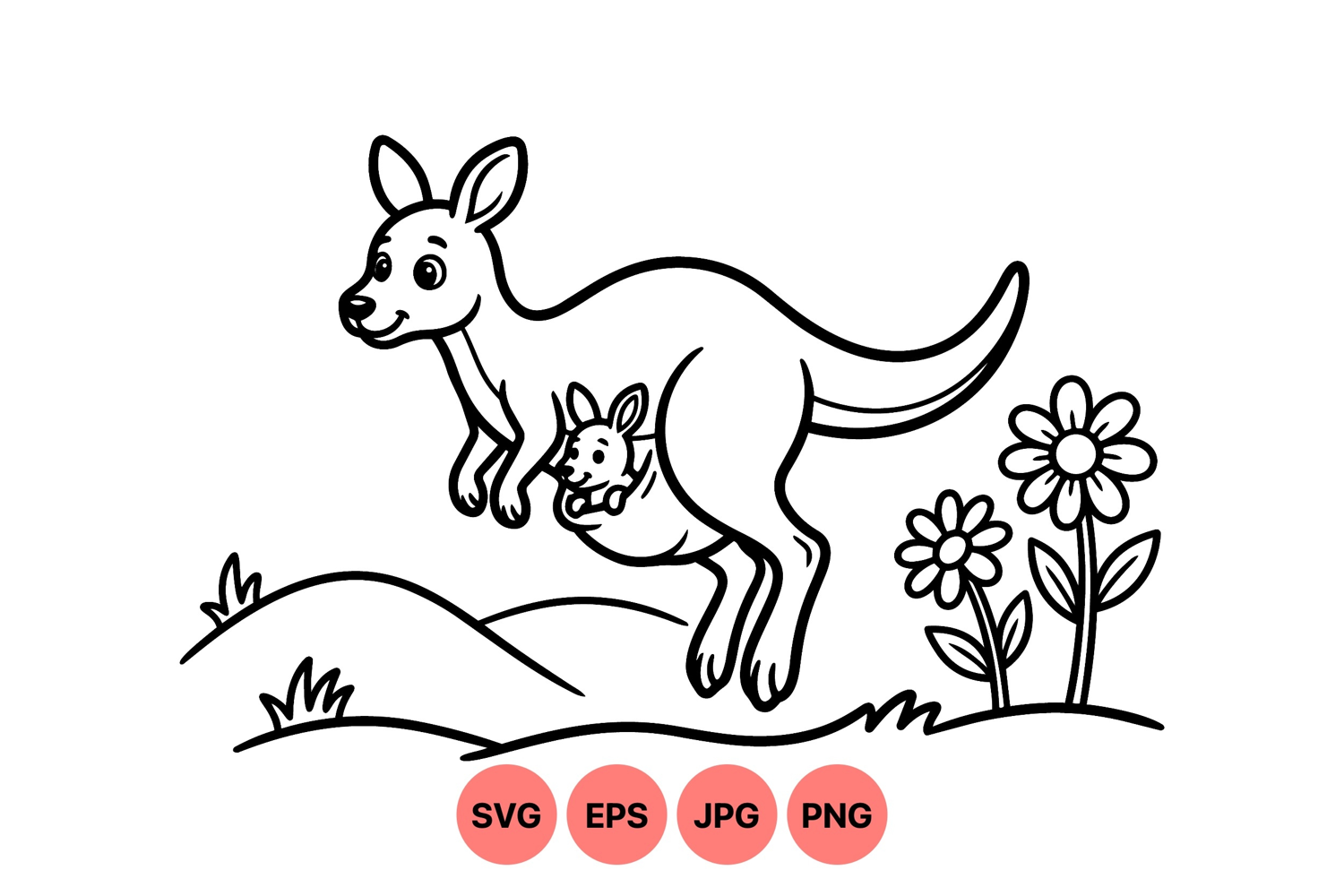 Playful line art vector showing a happy kangaroo jumping with a small joey in the pouch over simple grassy hills next to blooming flowers in black and white style lively