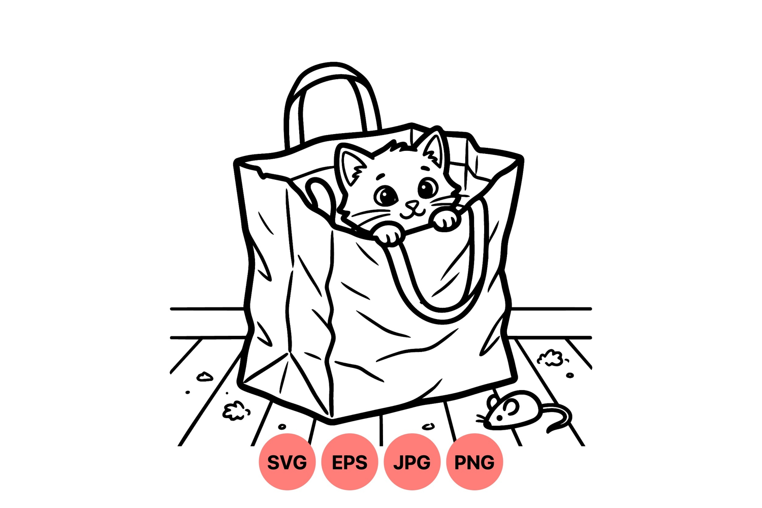 Black And White Vector Animal Line Art Cat Vector Art Cute Kitten Illustration Mouse Clipart Design Cartoon Cat Drawing Playful Animal Drawing Paper Bag Graphic Kitten Svg Graphic Pet Illustration Design