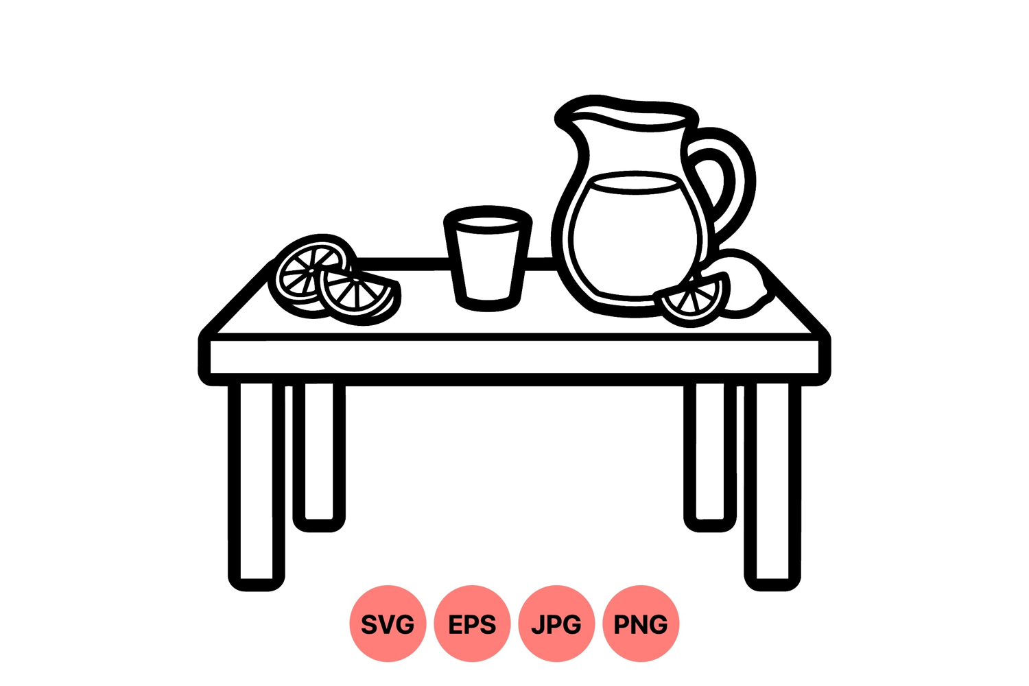 Minimalist black and white line art showing a pitcher filled with liquid a glass and lemon slices placed on a wooden table in a clean flat vector style perfect for food or drink themed illustrations