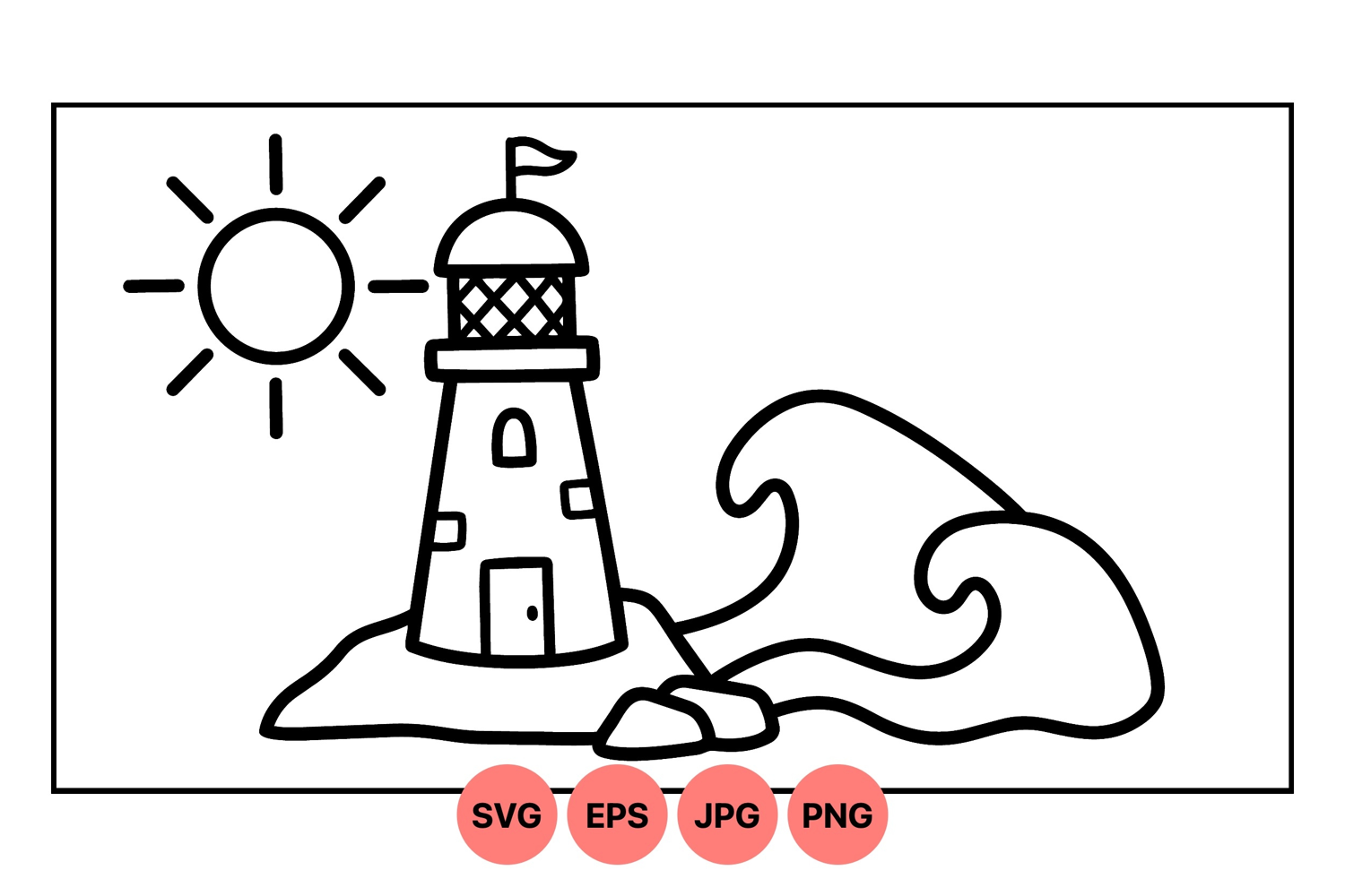 Simple black and white line art depicts a lighthouse standing on a rocky island with sun rays and curved ocean waves in minimalist vector style, offering a clean peaceful coastal vibe