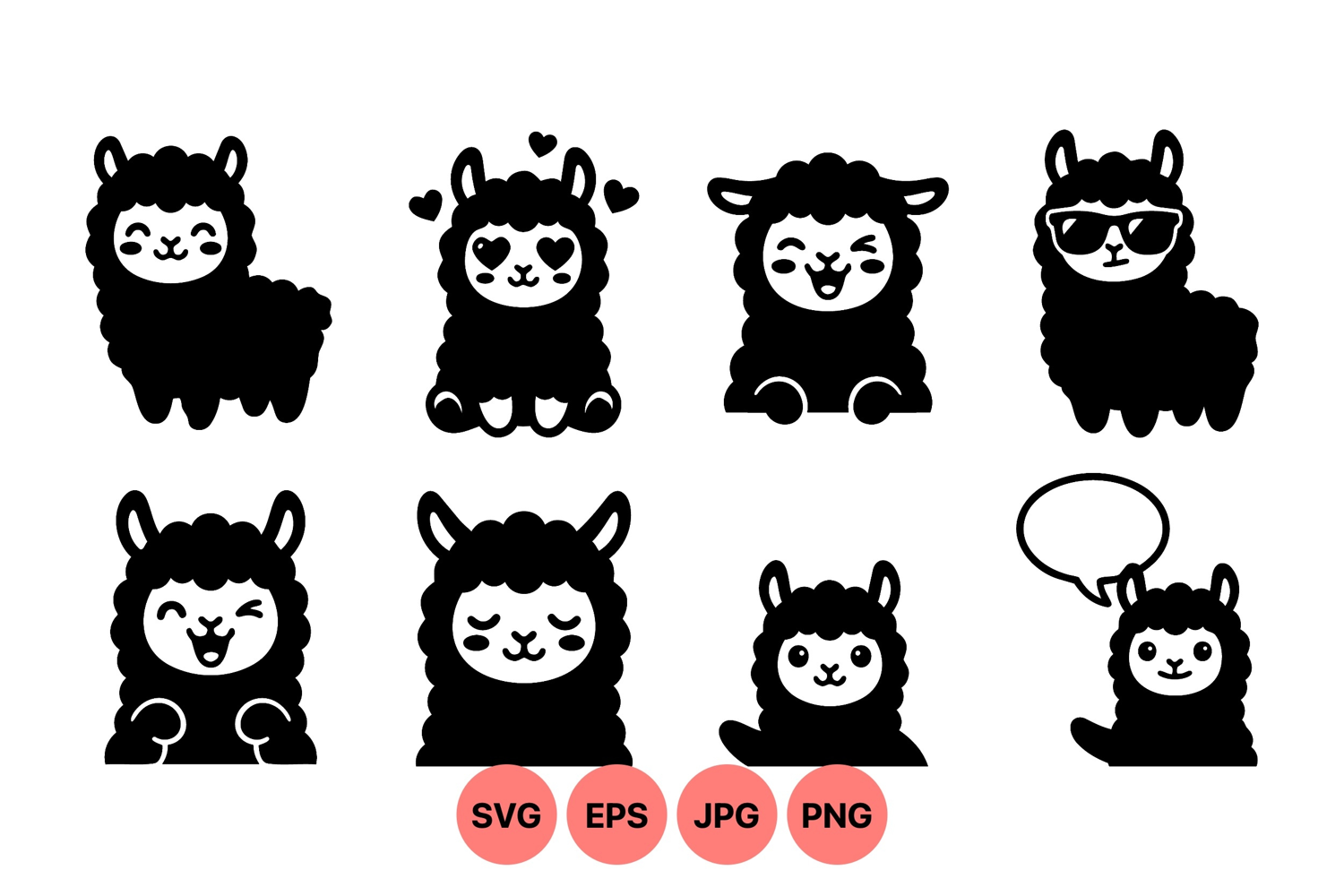 of playful alpaca vector icons showing varied facial expressions such as winking laughing love and cool glasses featuring monochrome flat design for fun graphic projects