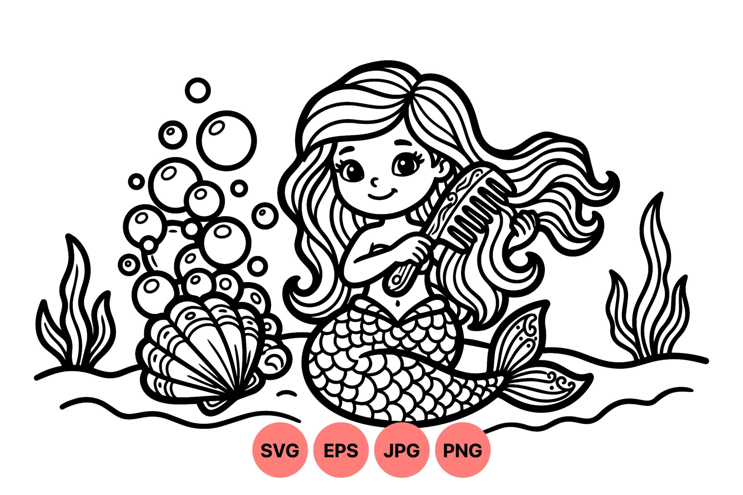 A charming mermaid brushes her flowing hair surrounded by bubbles seaweed and a seashell in a simple black line art style for coloring books or children illustrations playful and whimsical mood