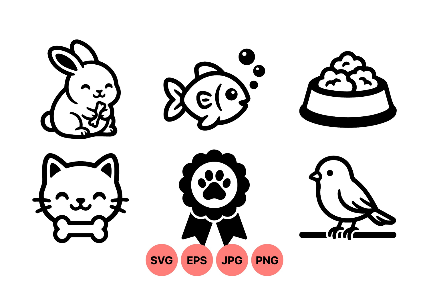 A of simple black and white vector icons including a happy bunny nibbling a carrot, a blowing bubbles fish, a pet food bowl, smiling cat with bone, pet award ribbon, and perched bird in minimal style.