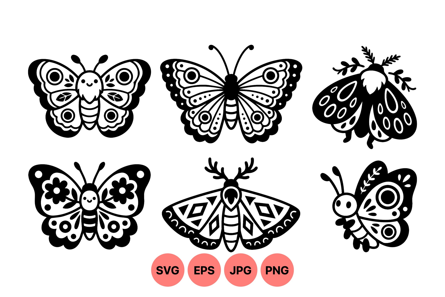 A of six flat design butterfly and moth vector illustrations in black and white featuring symmetrical wing shapes and floral decorative motifs, suitable for print and digital projects in a minimalist style.