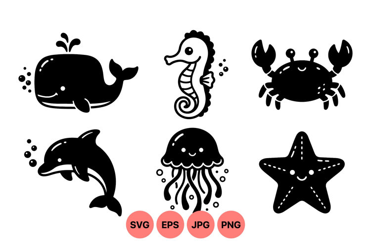 Cute marine animal icons including whale, seahorse, crab, dolphin, jellyfish, and starfish in cartoon black silhouette style suitable for children projects and ocean themes.