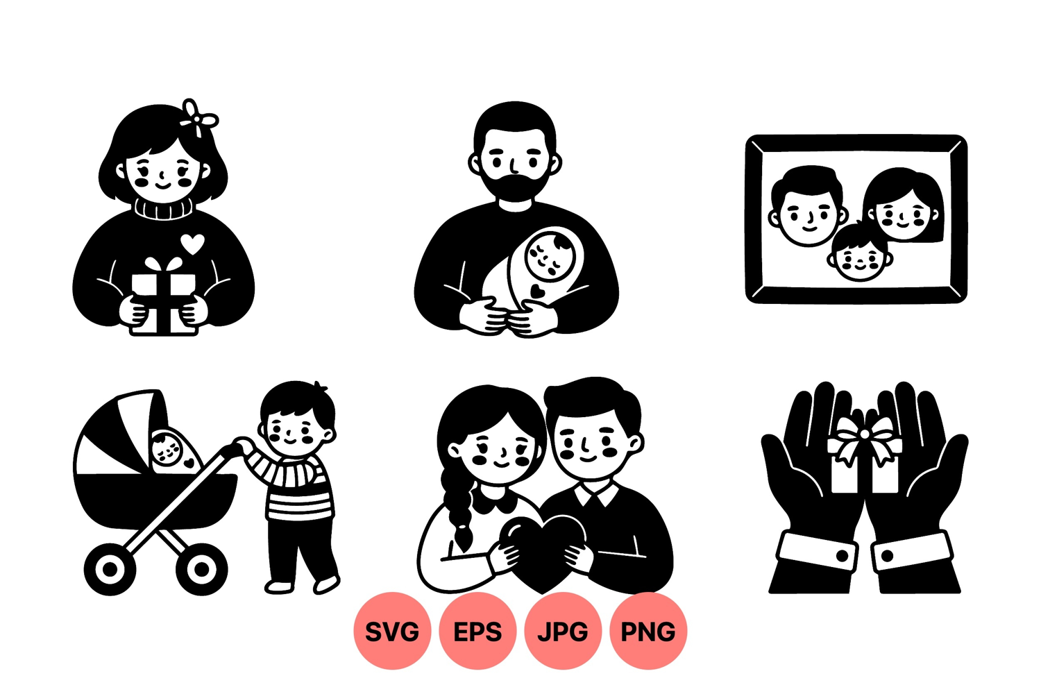 Simple black and white family themed icons show a woman with a gift a man holding a baby a child pushing a stroller a couple holding a heart and family photo vibrant