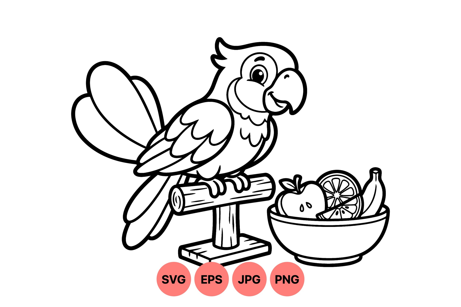 Black And White Clipart Vector Line Art Tropical Bird Illustration Animal Cartoon Art Fruit Bowl Clipart Kids Coloring Design Cute Parrot Drawing Wooden Perch Drawing Fruit Slice Illustration Svg Bird Graphic