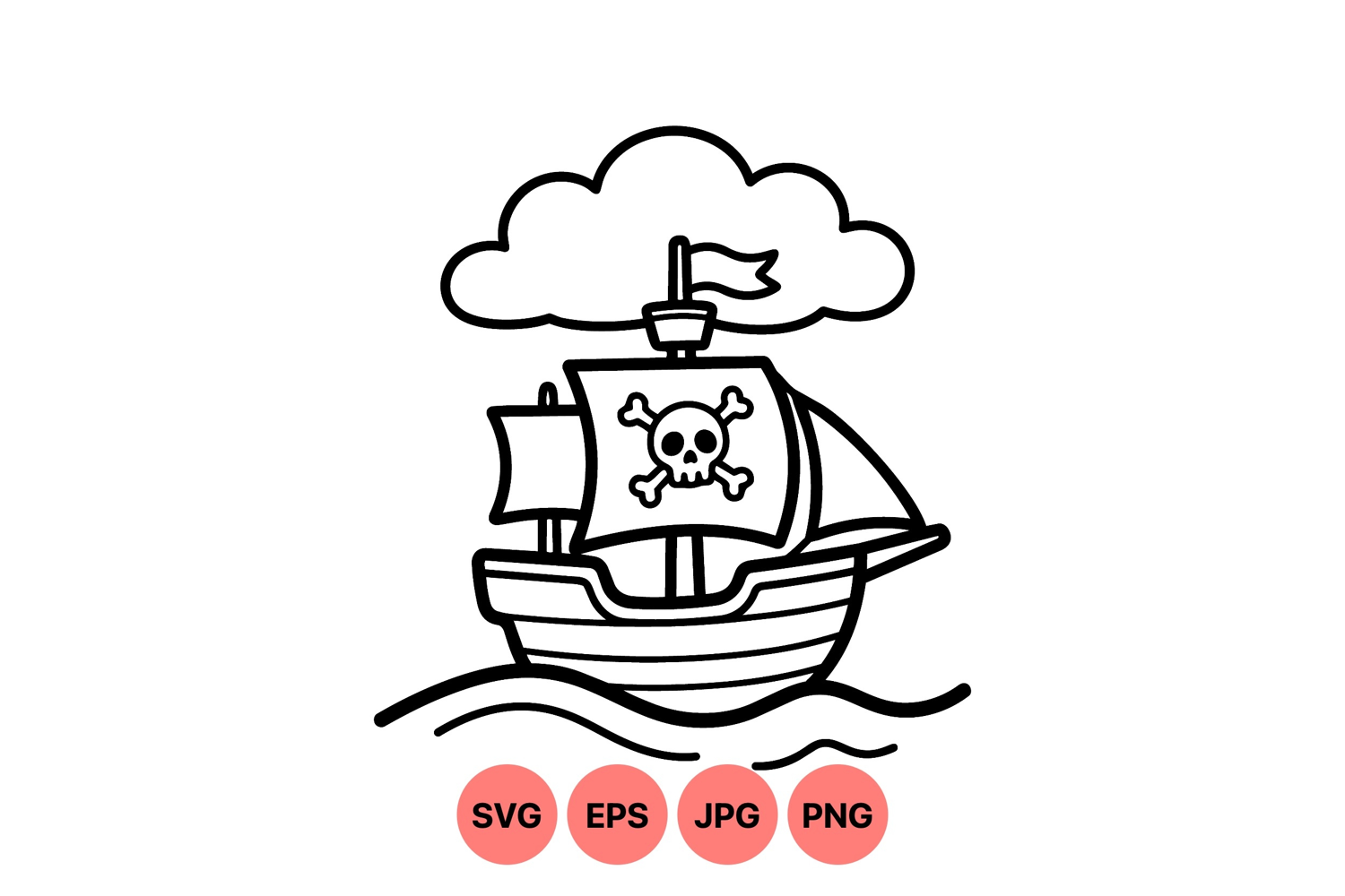 A minimalist black and white vector line art of a pirate ship sailing on wavy water with a skull and crossbones flag and a cloud floating above creating a playful nautical theme