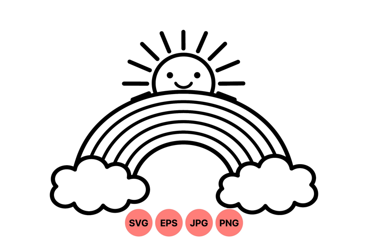 A smiling sun rises behind a rainbow with fluffy clouds featuring clean bold black line art style suitable for coloring books childrens designs cheerful mood