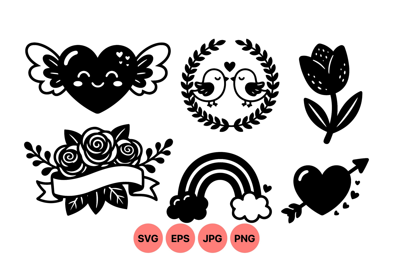 Simple black silhouette love themed icons show a smiling heart with wings kissing birds in a laurel wreath roses with blank banner tulip flower rainbow with hearts and pierced heart illustration cute design