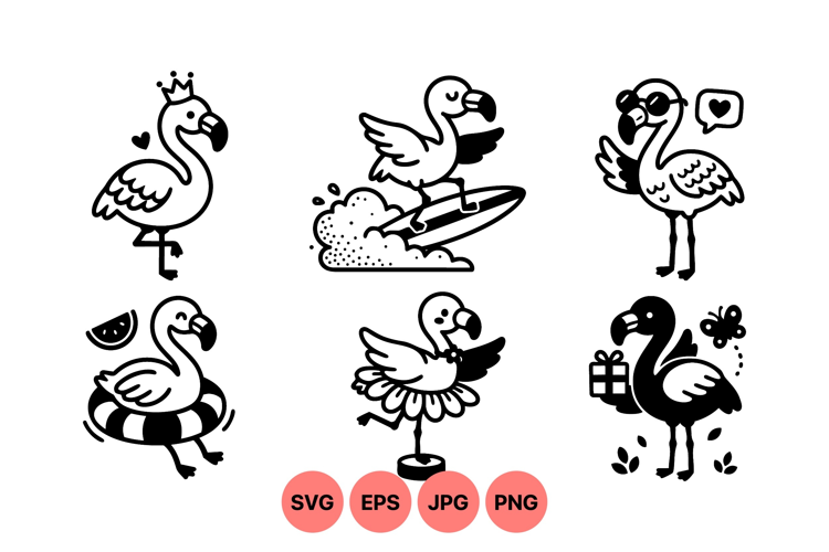 Minimalist black and white vector displays flamingo characters in various fun poses including surfing dancing and celebrating with gift and watermelon summer vibes playful mood