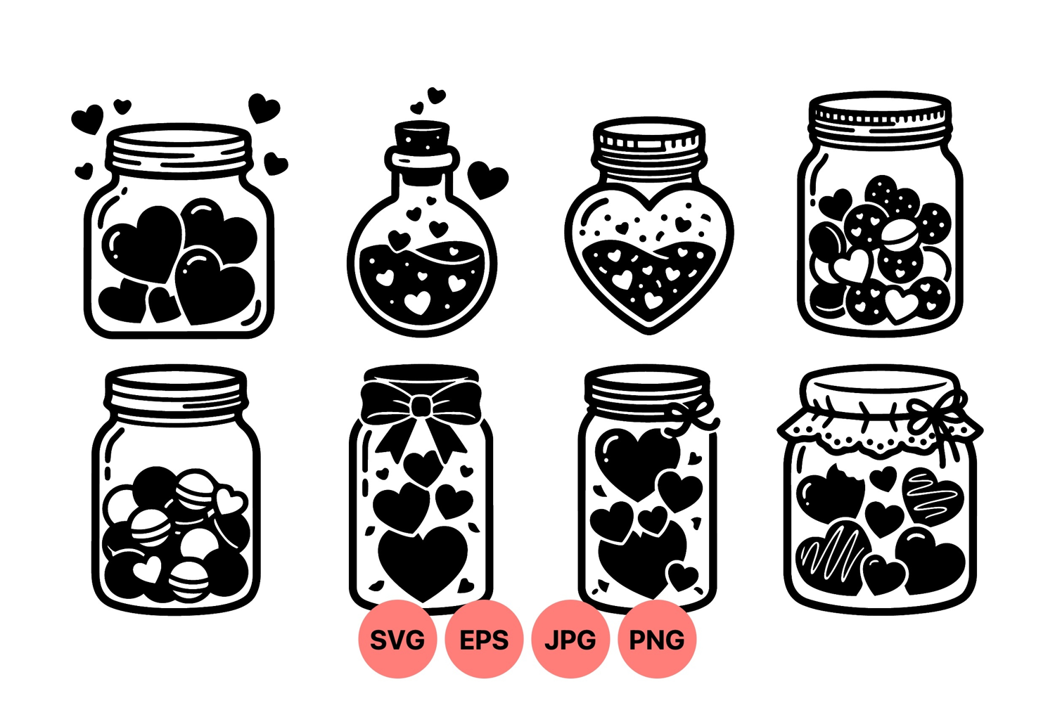 of black and white vector jar icons filled with heart shapes and decorations in different styles suitable for romantic or love themed designs and projects elegant minimal