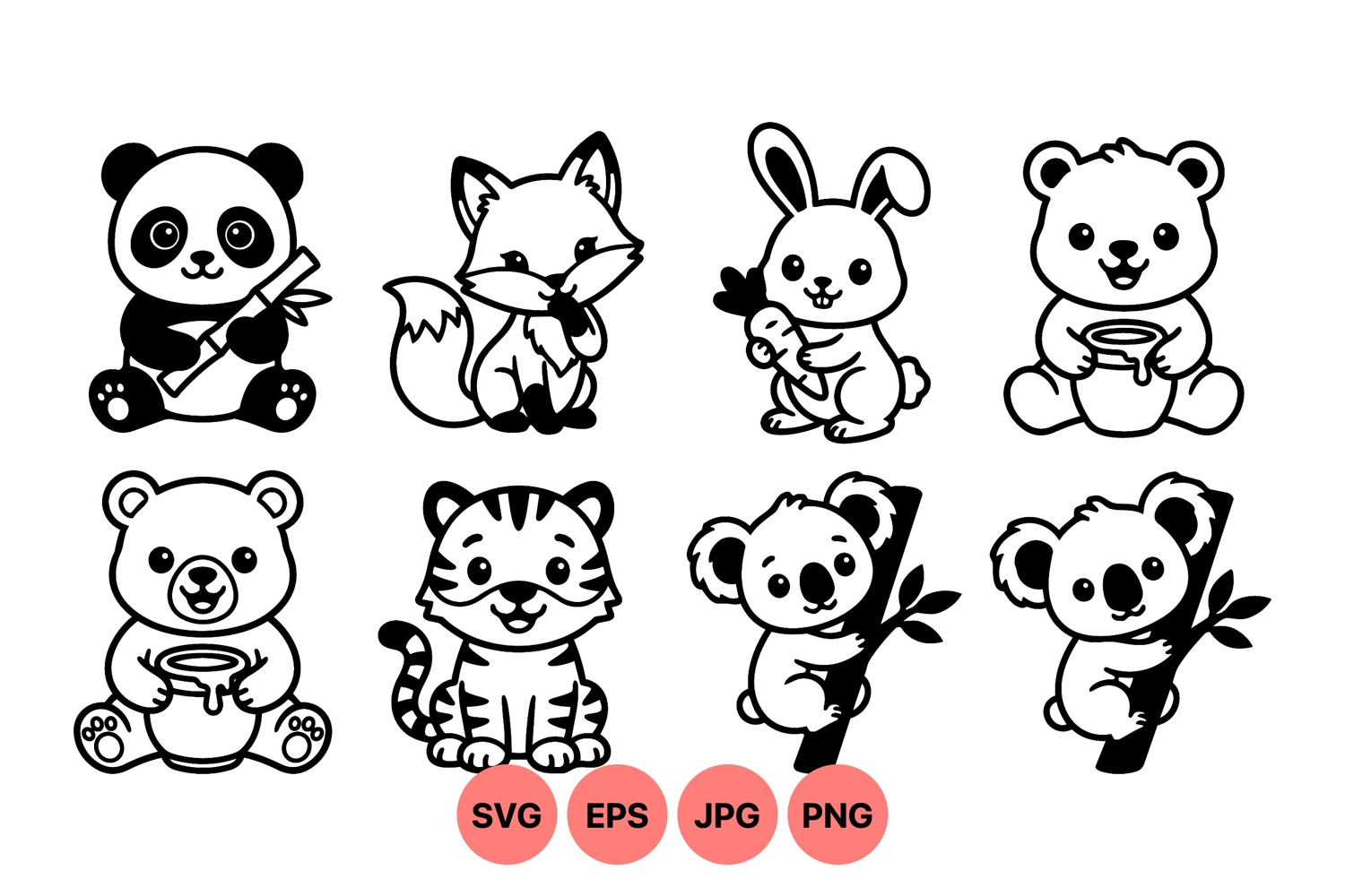 of charming black and white animal vector icons featuring panda holding bamboo, fox sitting, rabbit hugging carrot, bear with honey pot, tiger smiling, and koala clinging to branches in minimalist style.