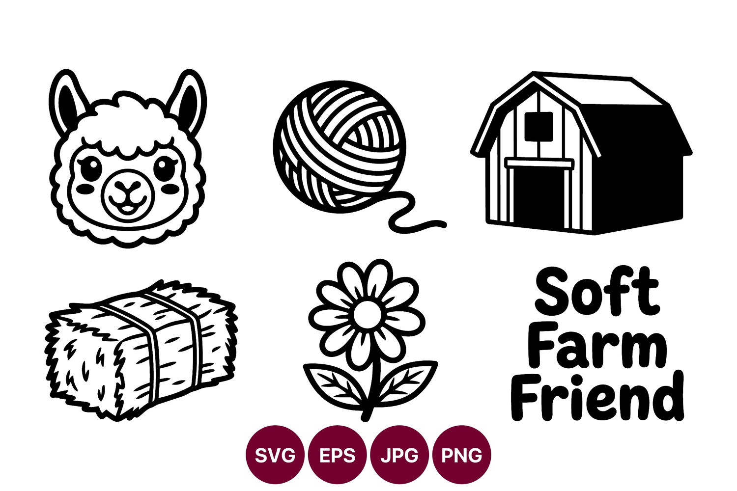 A black and white line art vector showing a llama a ball of yarn a barn a hay bale and a flower in playful farm style