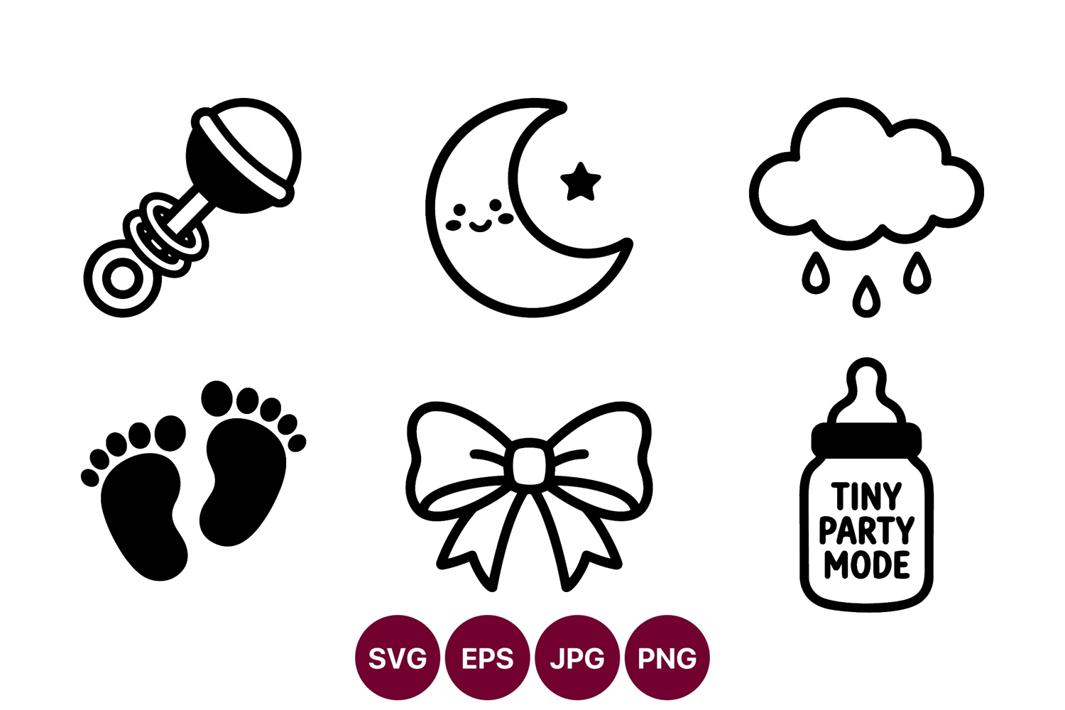Clip Art Party Icons Nursery Decor Bottle Icon Baby Rattle Baby Icons Baby Items Monochrome Icons Moon Cloud Feet Footprints