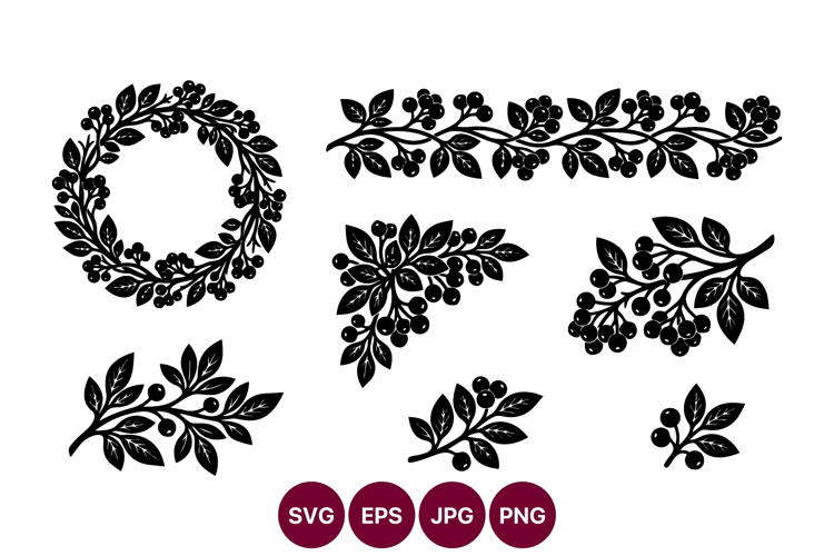 Black silhouette berry branches arranged as wreaths and clusters, offering decorative vector elements for borders and designs.