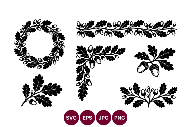 Black and white vector line art showing acorn clusters oak leaves forming decorative wreaths and borders with a natural botanical mood