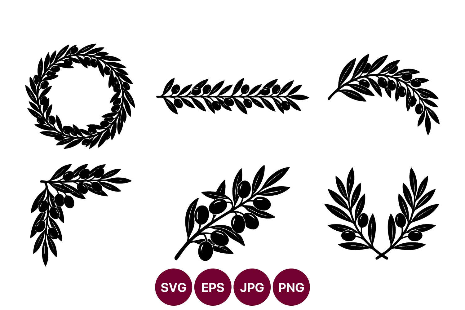 Six black olive branch wreaths are presented as classic decorative motifs in clean vector silhouettes suitable for print and digital projects.