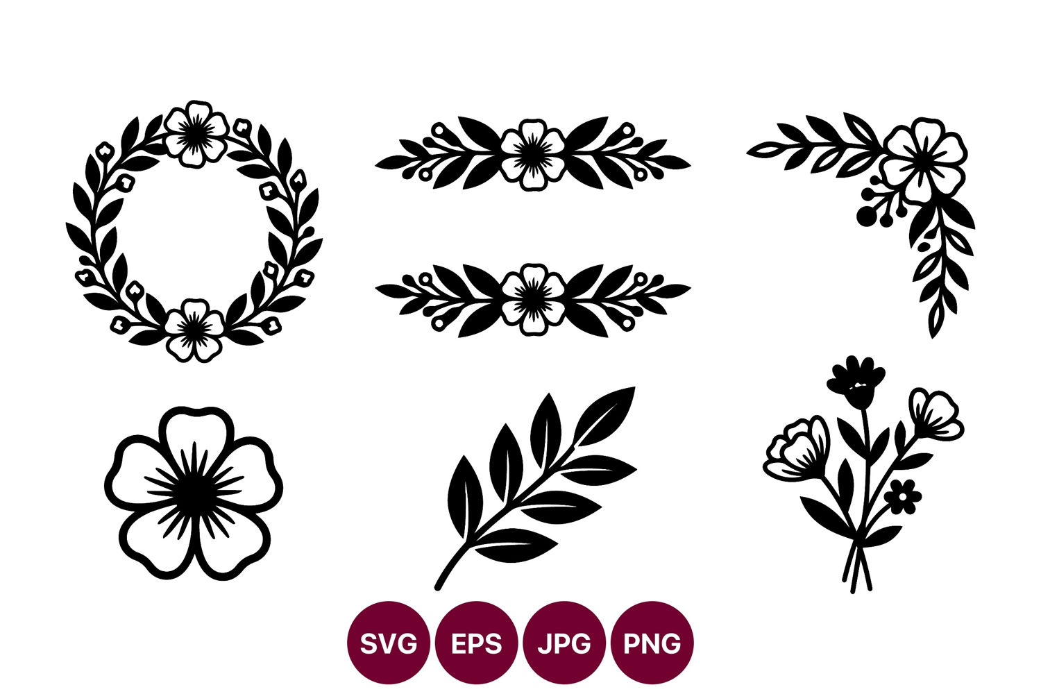 A of black and white floral vector graphics featuring blossoms laurel branches and decorative accents suitable for invitations and branding