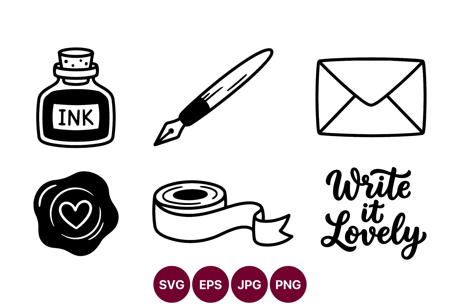 A black and white line art vector features an ink bottle a nib a sealed envelope a wax seal with heart a ribbon and the phrase write it lovely in cursive.