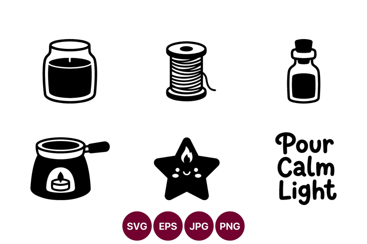 A black and white vector line art featuring candles jars and a spool with the phrase pour calm light