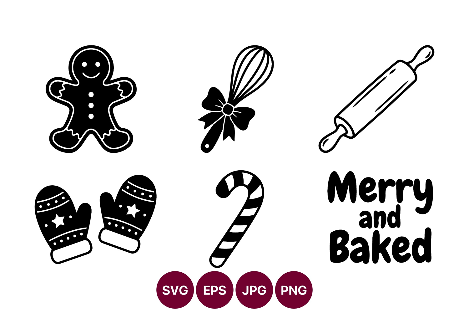 A black and white vector collage showing christmas baking icons including a gingerbread man mittens candy cane rolling pin and whisk