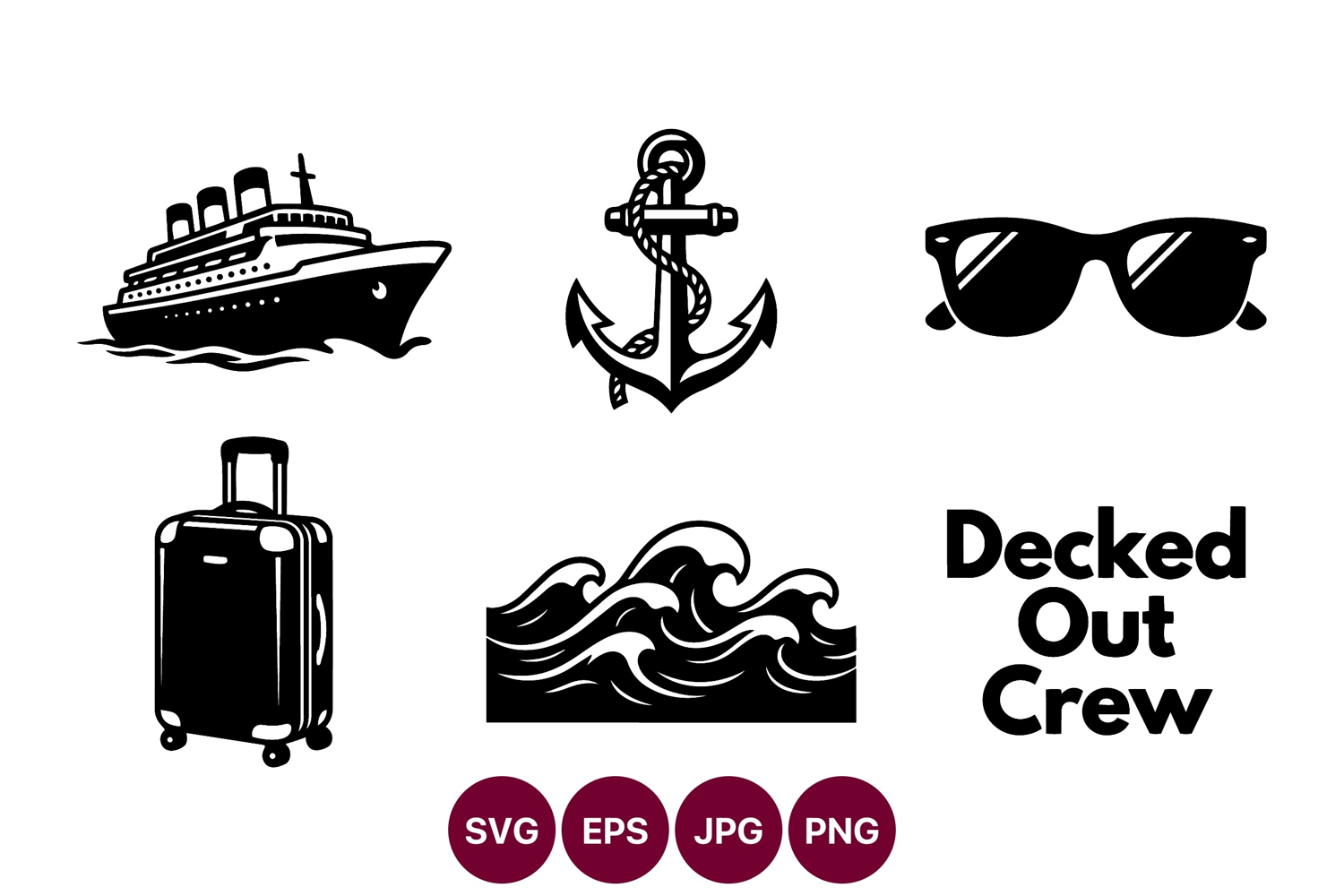 Bold black and white vector featuring a cruise ship, anchor, sunglasses, suitcase, waves, and the text decked out crew in a clean line art style.