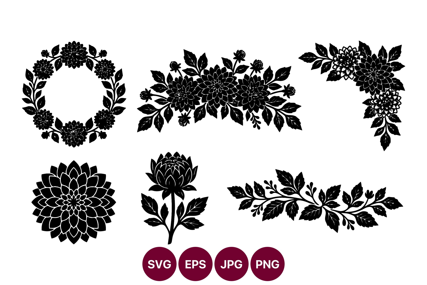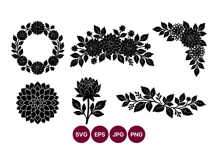 Black floral vector patterns showing a circular wreath, ornate border band, corner spray, round blossom, single stem flower, and leafy vine for decorative projects.